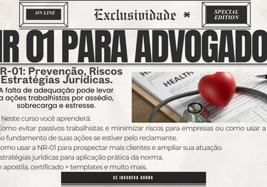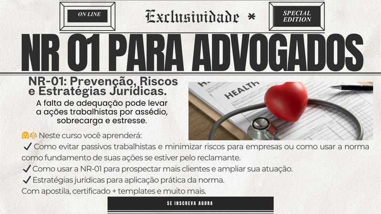 A NR-01 deixou de ser obrigação formal e passou a ser estratégia jurídica. Aprenda a usar riscos psicossociais, prevenção e gestão para construir provas, fortalecer teses e ampliar sua atuação no Direito do Trabalho.